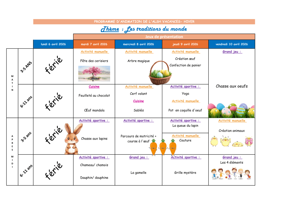 - Du lundi 07 avril au 10 avril : Les traditions du monde